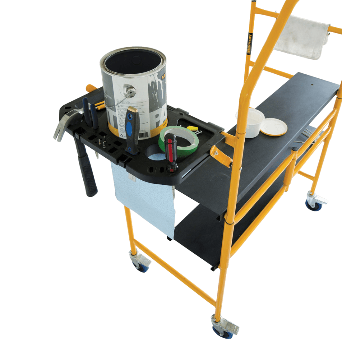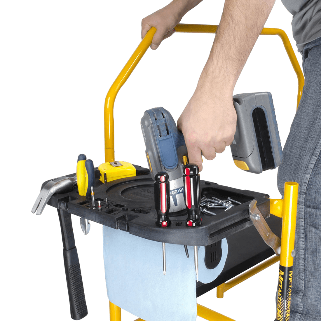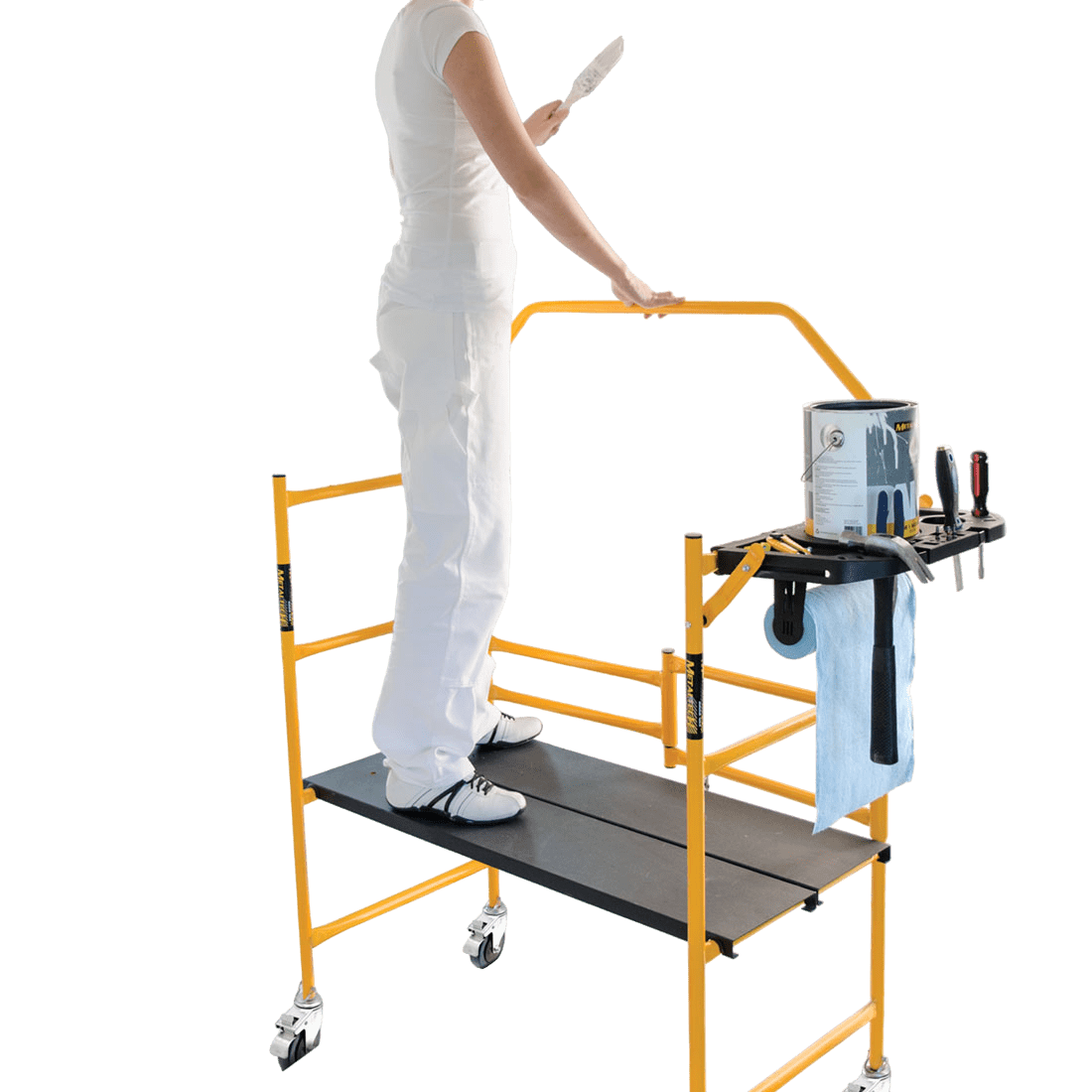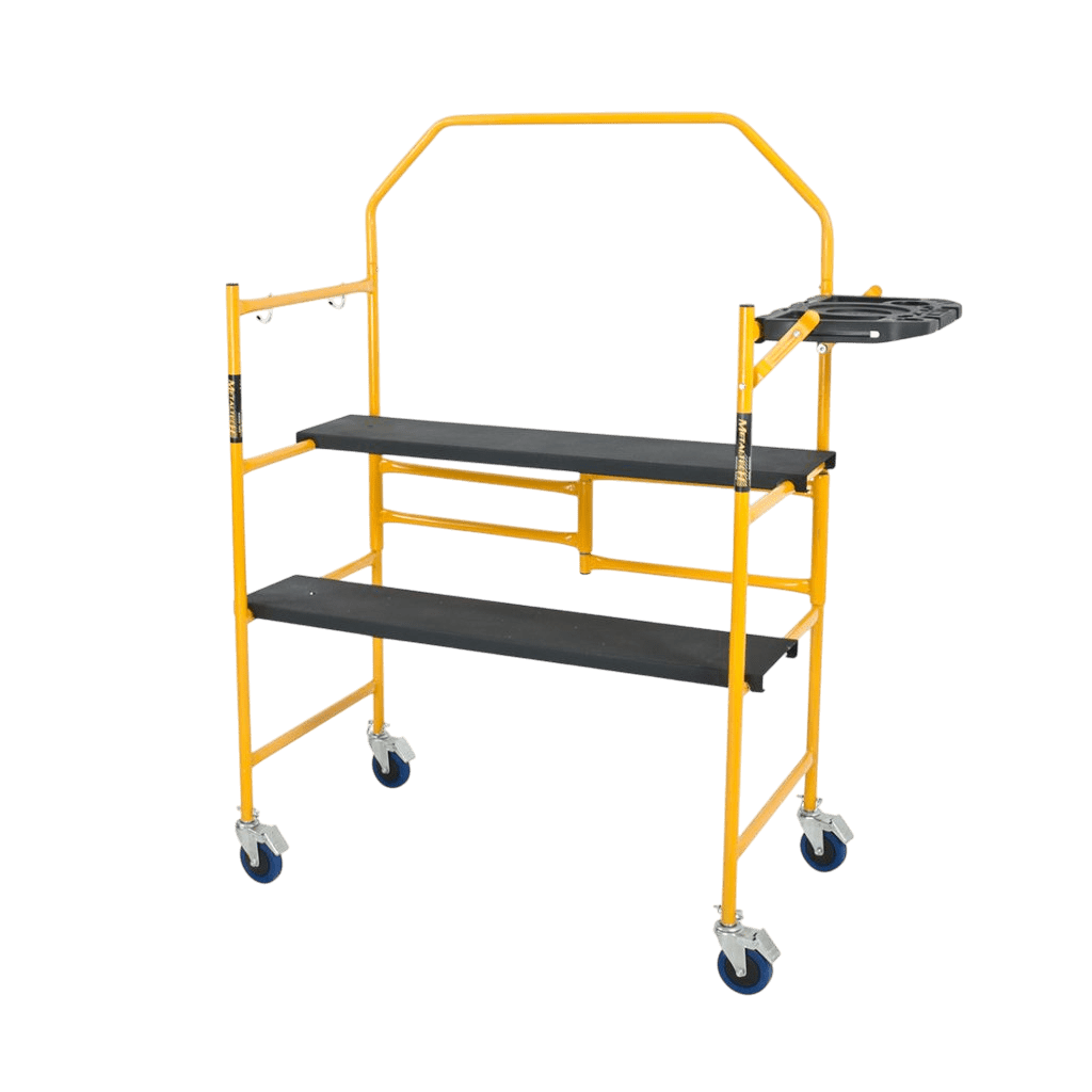 El andamio Jobsite de Metaltech en Acero es la solución ideal donde la comodidad para trabajar, practicidad en el transporte se combinan brindando una alternativa idónea para realizar actividades a baja altura como reparaciones locativas, obra blanca, inspecciones o instalaciones en bodegas , locales comerciales , sector institucional y demás sitios que necesitan versatilidad en la ejecución, fabricado en tubería de acero calibre 16, ruedas de 10 cm con freno de servicio pesado , plataformas antideslizantes y portaherramientas, capacidad de carga combinada de 227 kg ( 113 kg por plataforma) , cuenta con certificaciones ANSI , CSA Y OSHA ,además de ir en línea con la resolución 4272 de 2021.