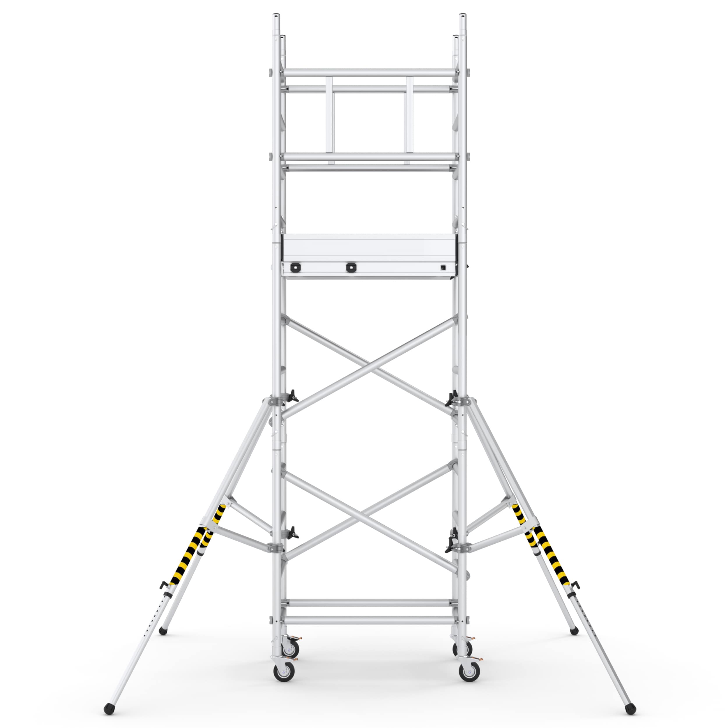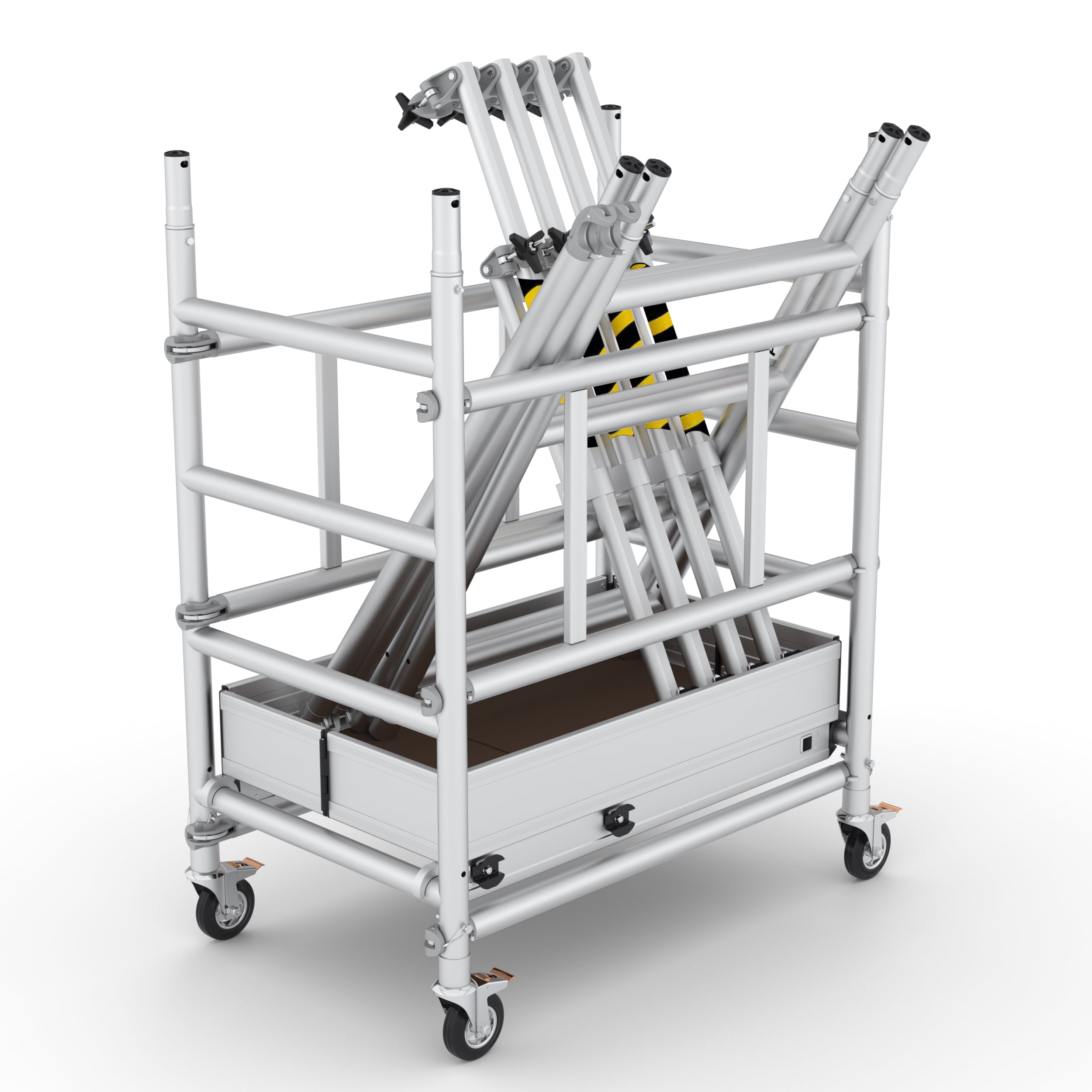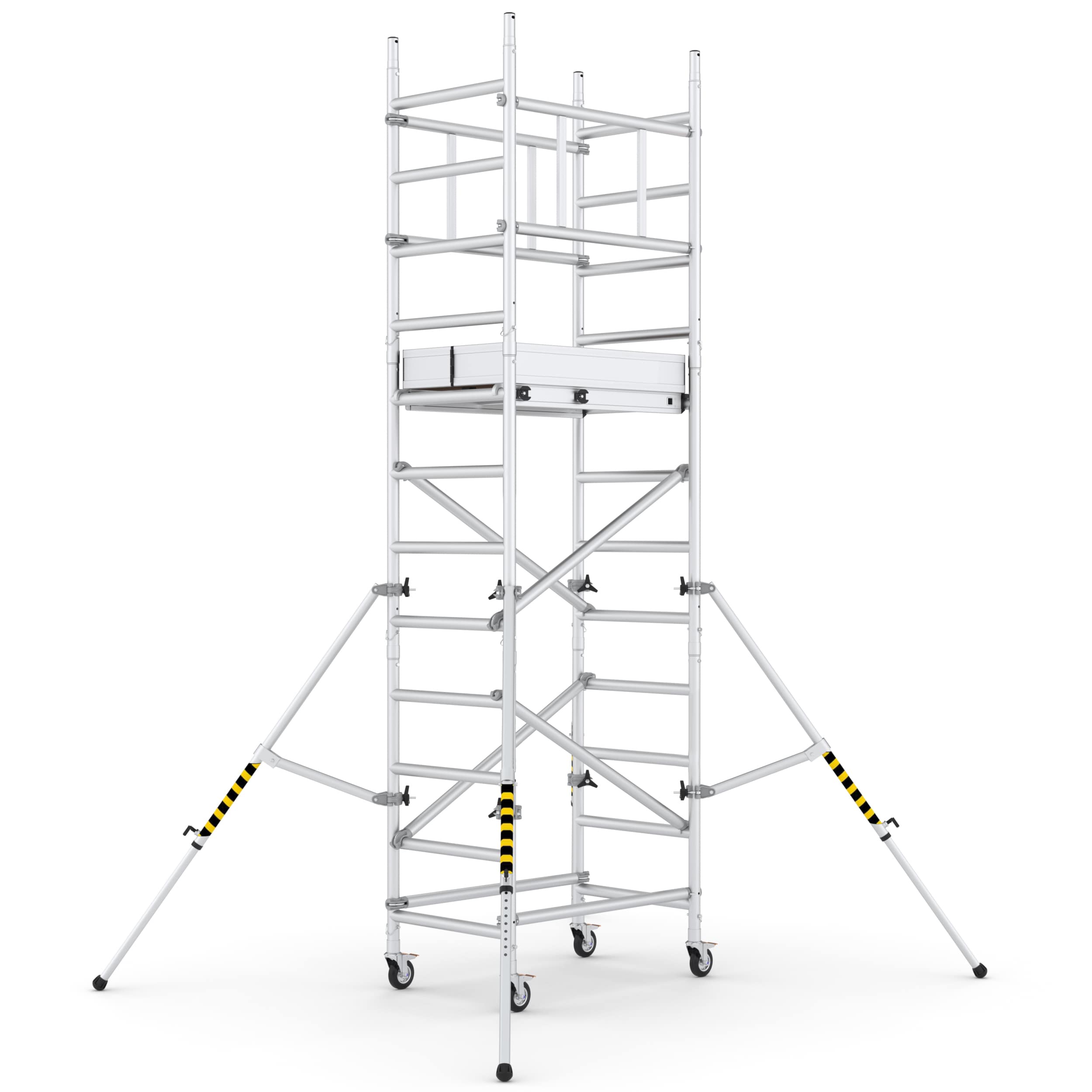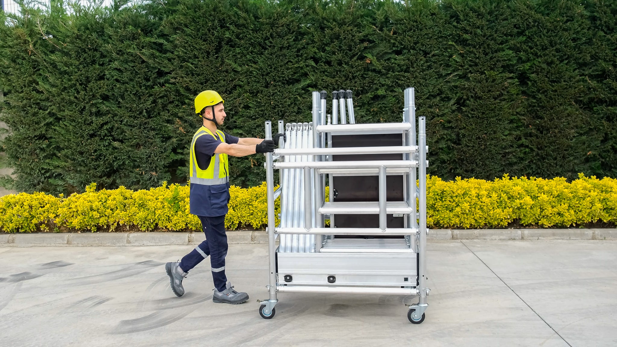El andamio móvil Solo RAM ® en aluminio, es un equipo de nueva generación que revoluciona por completo su segmento, puede ser transportado, armado y operado por una sola persona, nunca fue tan fácil la puesta en marcha de trabajos que requieren autonomía, practicidad, maniobrabilidad y seguridad, se trata de un equipo compacto fabricado en aluminio de alta resistencia en una línea de producción con equipos de soldadura robotizada que garantiza una altísima calidad en todas sus líneas, su bajo peso y características móviles permiten usarlo tanto en interiores como en exteriores, Producto certificado bajo la Norma EN1004 del comité europeo de normalización , resistencia de 200 KG, equipo con superficie de trabajo cómoda y segura 113×73 cm que permite el uso prolongado , cuenta con ruedas con freno para movilizarlo fácilmente, permite su uso a varias alturas gracias a su estructura modular, trabaje siempre resguardado debido a sus barandas perimetrales, incluye rodapiés y estabilizadores telescópicos para mantener siempre la estabilidad.