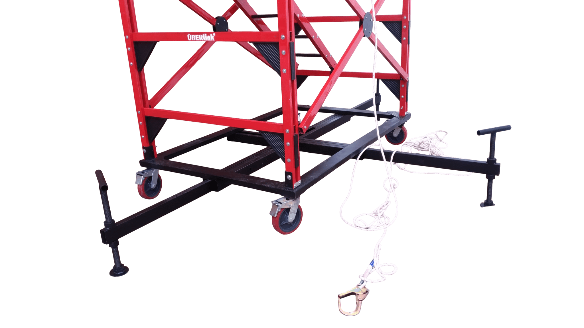 Base para estabilizar torres de andamio en Acero o aluminio, fabricada en acero, incluye 4 ruedas con freno y tornillos niveladores, consulte para cuales configuraciones de torre es necesario usarla para auto estabilidad.